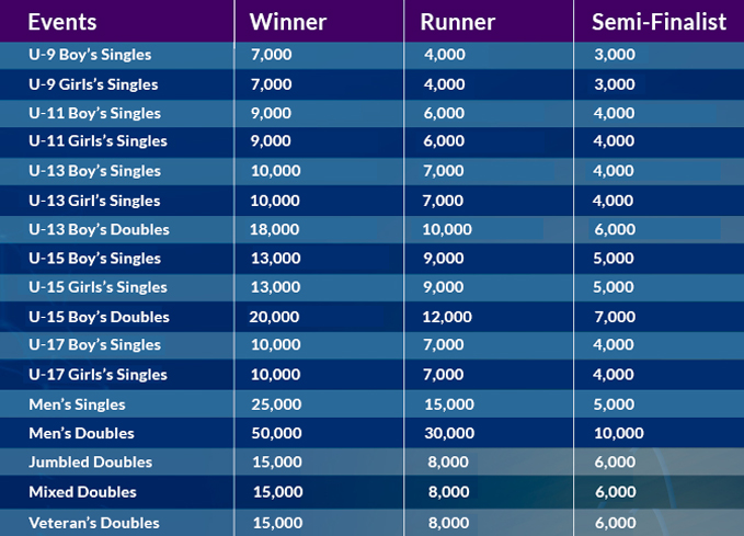 U-15 (Boys Singles, Girls Singles, Boys Doubles)