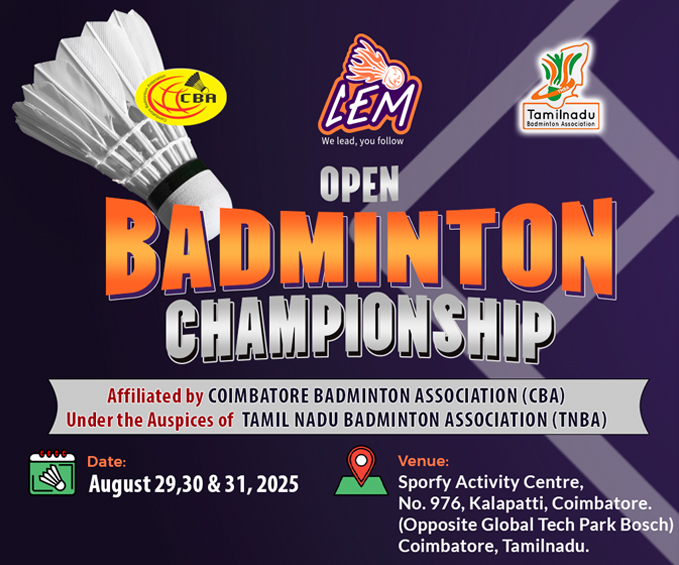 The LEM’S open badminton tournament has gained a huge response among badminton admirers in the past events. We are glad to inform you all that LEM’S THIRD YEAR OPEN BADMINTON CHAMPIONSHIP 2025 FOR JUNIOR’S and SENIOR’S will be conducted on the following dates, AUGUST 29,30 & 31 of this year at Sporfy Activity Center, Coimbatore in association with CBA and TNBA. We are delighted to announce that winners will be rewarded with cash prizes, trophies and gifts worth of rupees seven lakhs (Rs 7,00,000) along with stunning trophies. We also planned to recognise players who secure second, third and fourth places with cash prizes and exciting trophies.